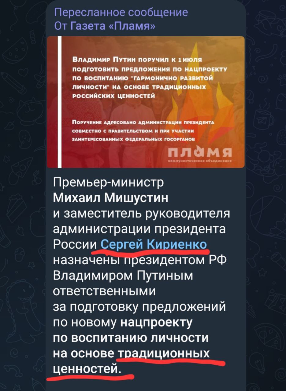 С традиционными ценностями все понятно. Они будут, и их будет много! Правда, существует такая вероятность, что вы можете их и не узнать, ведь исполнителями назначены "лучшие" люди. Да, именно Сергей ВК Кириенко отныне будет учить вас ценностям. И не спрашивайте как...
