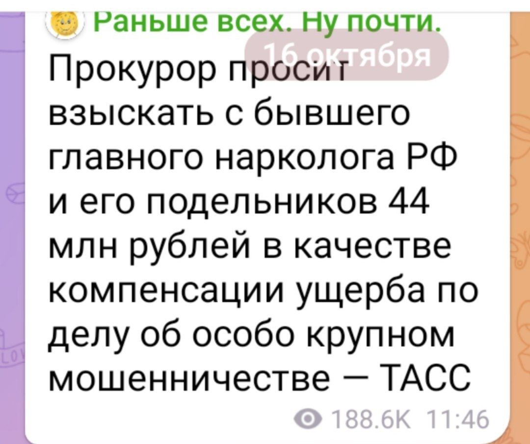 ⚡️Суд приговорил к 7 годам лишения свободы и штрафу бывшего главного нарколога РФ Брюна по делу о многомиллионном мошенничестве.