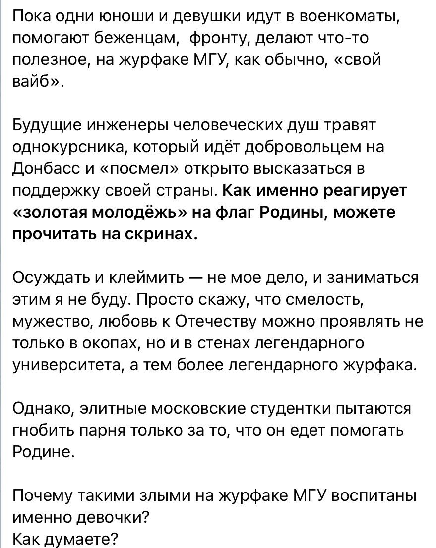 Всех студентов замаранных в предательстве выгнать и на фронт. Всех. Журналистка? Писать из окопов боевые листки. Или тюрьма в случае отказа. |