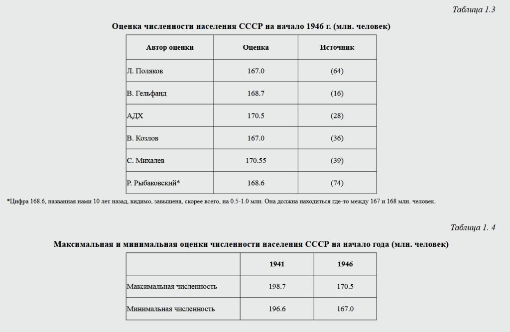 Диапазон значений численности населения на начало 1946 г. составляет 167–170.5 млн. человек, что изначально может изменить людские потери в ту или иную сторону на 3.5 млн., тогда как цифры, характеризующие численность населения на начало 1941 г., отличаются всего на 2.1 млн. (табл.1. 4.).