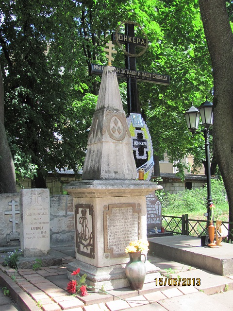 Рядом Крестом и плитой установлено старинное надгробие, спасенное Русскими патриотами летом 1995 года, когда подручными Малевича был совершен акт вандализма: