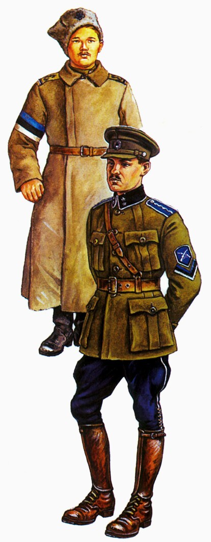 Estonian Infantryman has a full Russian uniforms, on his sleeve - armband the Estonian national colors; on the shoulder straps with the letter "E" - blue, black and white stripes.
