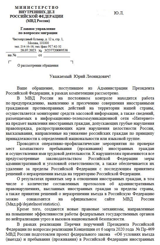 Наши соратники пишут в Администрацию Президента по вопросу миграции. Вот ответ.