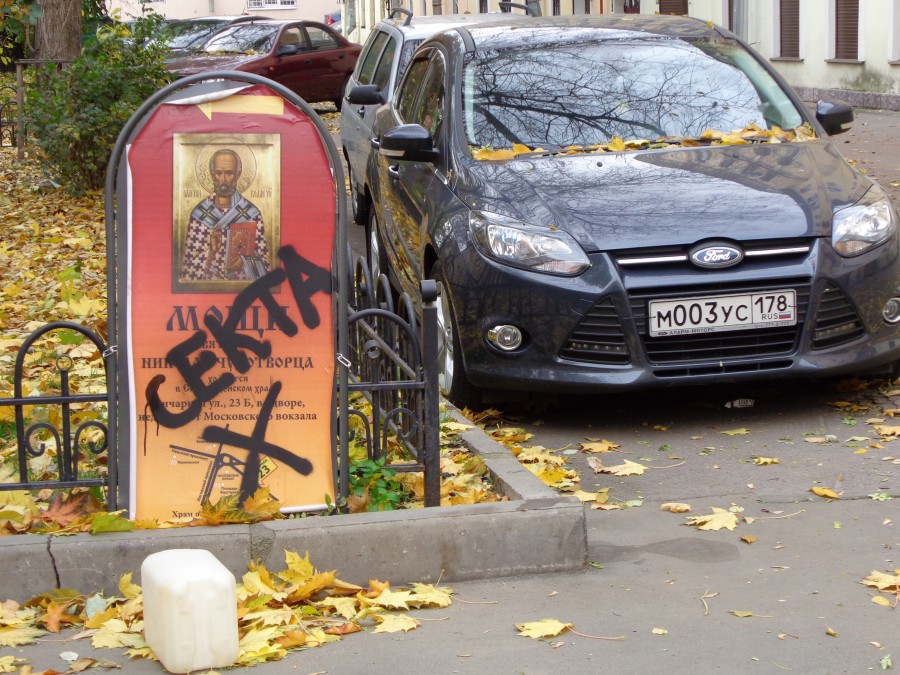Рекламные щиты на Васильевском острове и "церковь" в районе Площади Восстания.Использование баллончика с краской и нанесение антисектантских надписей. Ссылка на пост в главном паблике "Черной Сотни" в социальной сети В Контакте http://vk.com/chernosotnia?w=wall-29062072_5746