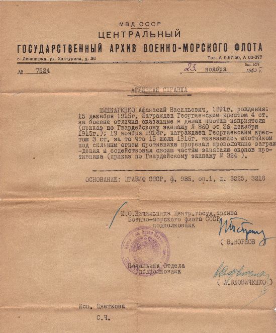 Комментарий к файлу: Справка из ЦГАВМФ о награждении Шинкаренко А.В. Георгиевскими крестами III, IV степени