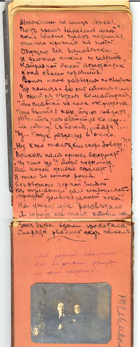 Стали появляться раненые: два у меня и два во 2-м эскадроне. Через некоторое время гусару Страшилину снарядом снесло полчерепа. Бедному гусару Ермаку, с которым я только вчера говорил о его прошлом ранении, оторвало ногу. Раненых оттаскивали в соседнюю хату за бугром. Гусар Страшилин очень мучился, умирая, и так стонал, что действовал на нервы других. Он умер, и его там же наскоро погребли, прочитав "Отче Наш", Скоро снаряд угодил в ту самую избу, где я сидел недавно с Беккером. Она сгорела, и надпись на стене исчезла.