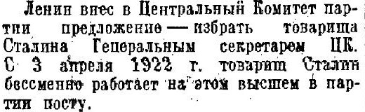 пленум Центрального Комитета партии по предложению В.И. Ленина избрал И.В. Сталина генеральным секретарём ЦК партии. На этом посту И.В. Сталин работал до октября 1952