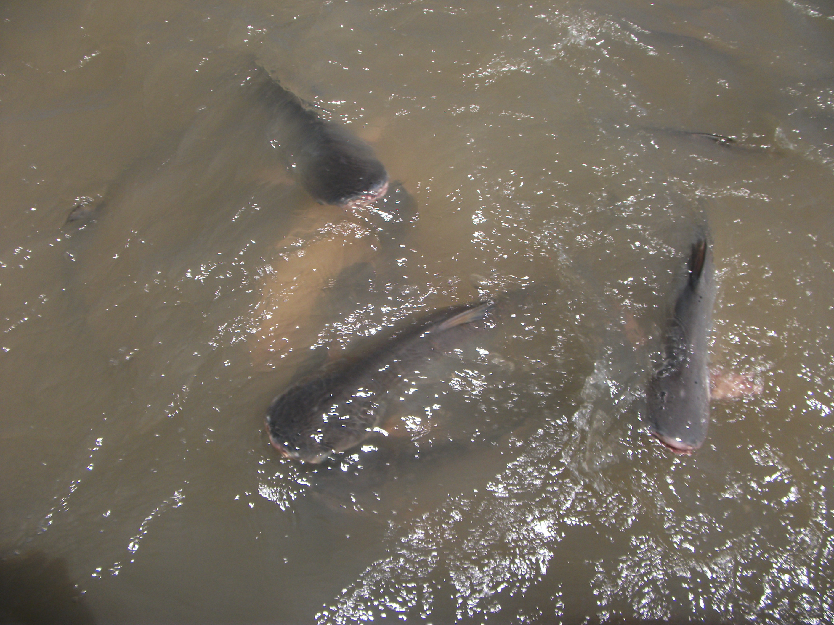 Однако с рынка сразу попадаем на пристань. Стоят такие странные корыта, в которые надо умудриться запрыгнуть, жутко вонючие отработанной соляркой. Корыта пыхтят, бурчат, ждут пока народ, рискуя жизнью, в них запрыгнет. И вот - путешествие по грязно-коричневой воде. Корыто идёт весело, и вскоре мы видим буддистский храм. И аккурат супротив него корыто делает пируэт, и гидша командует бросать хлеб за борт, то есть, "чистить карму". И тут... я впервые увидел кипящую воду не в кастрюле, а в реке! Рыбам так понравились чистые кармы, что они ринулись к корыту всей своей стаей! Слава Богу, что не водятся тут пираньи! Не то, что кармы, но и корыта не осталось бы целыми! Короче. Наглые и толстые рыбины в несметных количествах мигом сжирали целые булки, буквально в секунду раздирая их на части. Ловить рыбу тут запрещено (карма - штука серьёзная), и буквально через две-три минуты карма была вычищена у всех бросавших хлеб за борт. А если у кого грязь на карме где-то и оставалась, то хлеба всё равно уже не было...Вот они, кармоочистители: Вложение: