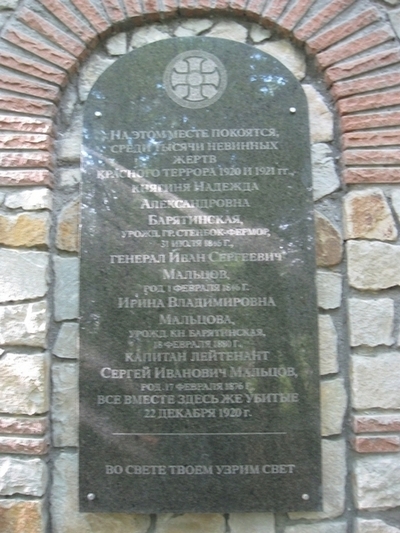Расстрелянная, будучи беременной, Ирина МальцОва, 40 лет, урожденная княжна Барятинская по отцу, а по матери урожд. графиня Стенбок-Фермор, по мужу, расстреляному капитан-лейтенанту - МальцОва. Его отца, генерала, тоже расстреляли с ними. Еще ген. Багратион, Бобырь и др. Сам юрист Багреев, хозяин дачи, лежит тоже там.