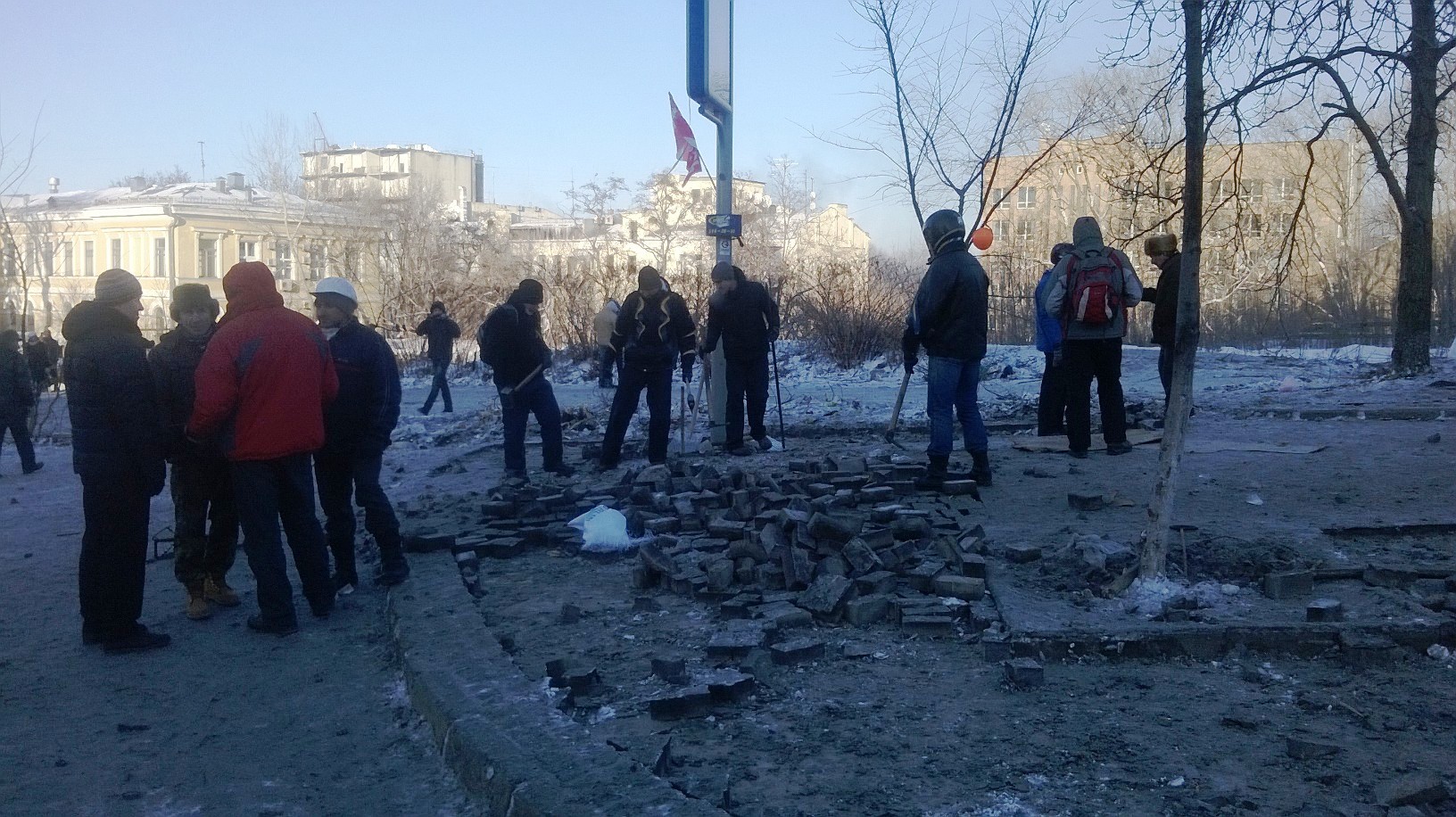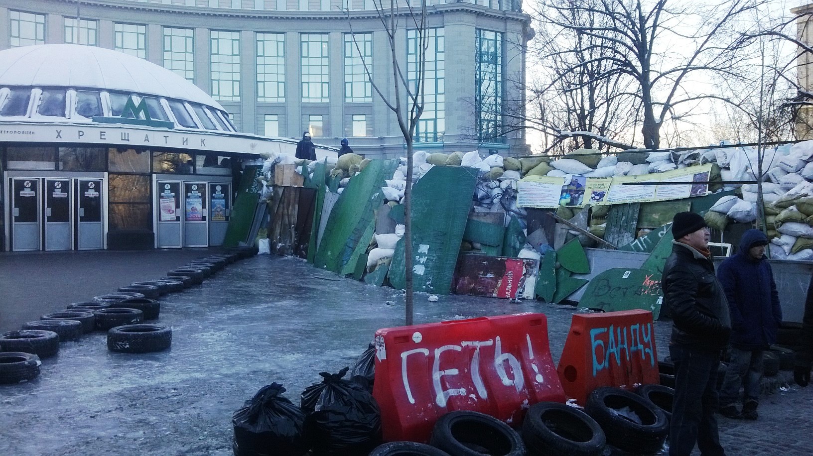 Новшество 2014 года – баррикады. Вокруг захваченной «майдановцами» территории сооружены самодельные защитные конструкции из подручных материалов. В ход идет все: доски, шины, пластмассовые и железные листы, но в основном – это мешки с песком и снегом.