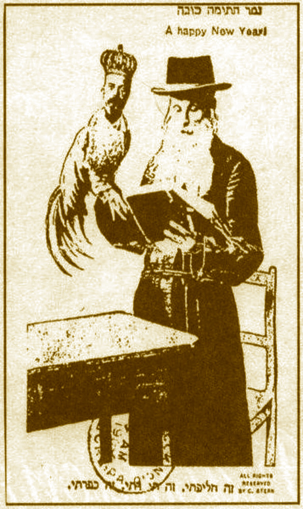 Дореволюционная еврейская новогодняя открытка, на которой раввин держит жертвенного петуха с головой Государя Николая II, со словами по-еврейски: «Это мое жертвоприношение».