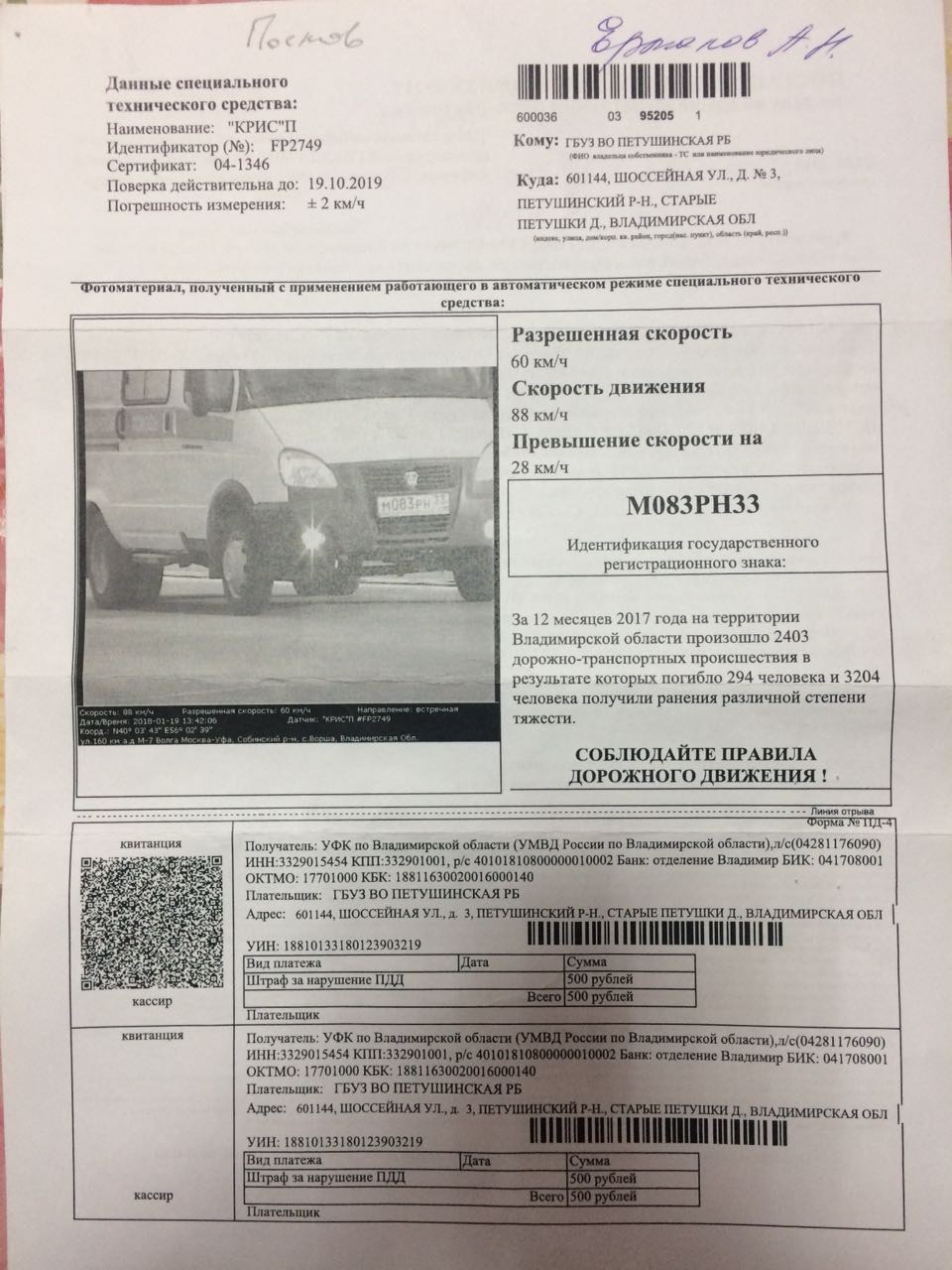В г. Петушки Владимирской обл. водитель скорой помощи получает штрафные квитанции за превышение скорости.