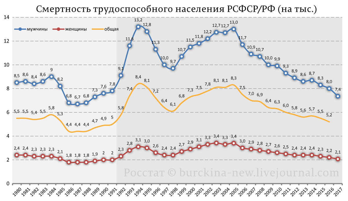 И самое страшное, что это длится до сих пор, так как cмepтнocть россиян в трудоспособном возрасте, т.е. от 15 до 65 лет до сих пор превышает уровень конца 80-х годов прошлого века: