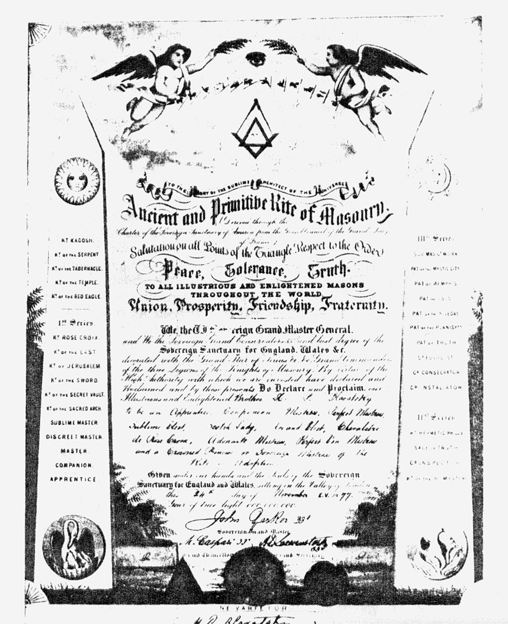 Мы, Трижды Величайший Верховный Великий Гроссмейстер, и мы, Верховные Великие Хранители тридцать третьей и последней степени Верховного Святилища Англии, Уэллса и так далее, отмеченные Великой Звездой Сириус и так далее, Великие Командующие Трех Легионов Рыцарей Масонства, облеченные добродетелью и высоким авторитетом, заявили и провозгласили и сим объявляем и провозглашаем нашего выдающегося и просвещенного Брата Е.П. Блаватскую Учеником и Компаньоном, Совершенным Магистром, Верховной Избранной Шотландской Леди, Великой Избранницей, Кавалером Розенкрейцеров, Преданным Магистром, Совершенным Преподобием и Коронованной Принцессой Ритуала Посвящения.