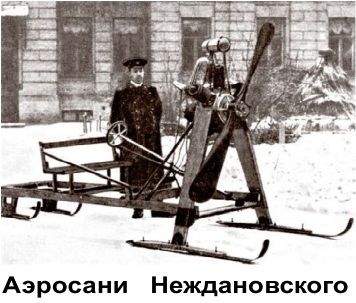 Одним из первых так поступил изобретатель С.С.Неждановский, занявшись этим в Кучинском аэродинамическом институте в 1903 году. К 1905 году он создал лёгкие каркасные аэросани, на которые устанавливался двигатель внутреннего сгорания с воздушным винтом. В том же году Неждановский опубликовал в журнале "Воздухоплаватель" статью "о санях с воздушным винтом для передвижения по снегу", где эта конструкция была подробно описана. И в этот раз - в отличие от многих и многих талантливых энтузиастов - изобретателю повезло: его аэросани заметил владелец и основатель авиазавода "Дукс" обрусевший немец Ю.А.Мёллер. Совместно с инженером А.Я.Докучаевым они создали усовершенствованную модель саней с рулевым коньком и двигателем мощностью 3,5 лошадиной силы. При движении по ровному снежному полю сани развивали скорость до 16 километров в час. Изделие выставлялось на 2-й Международной автомобильной выставке в Москве в 1908 году. После первой модели появились вторая и третья, которая